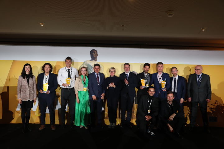 Dr. Gregor Jurak (third from left, white shirt) accepts the #BeActive Across Generations Award in Brussels, Belgium on behalf of the SLOfit team for acknowledging projects that promote inter-generational sport participation.